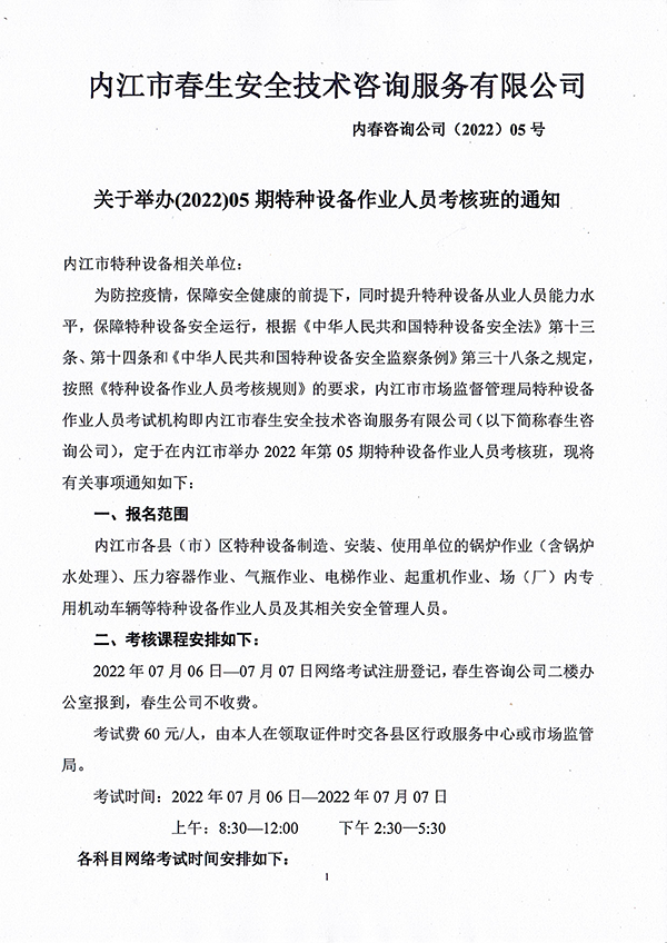 2022年春生公司05期特種設備作業(yè)人員考核時間安排