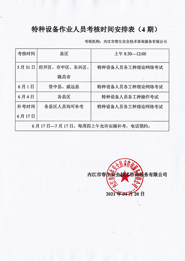 2021年春生公司04期特種設(shè)備作業(yè)人員考核時間安排