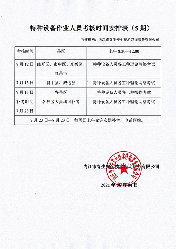 2021年春生公司05期特種設備作業(yè)人員考核時間安排