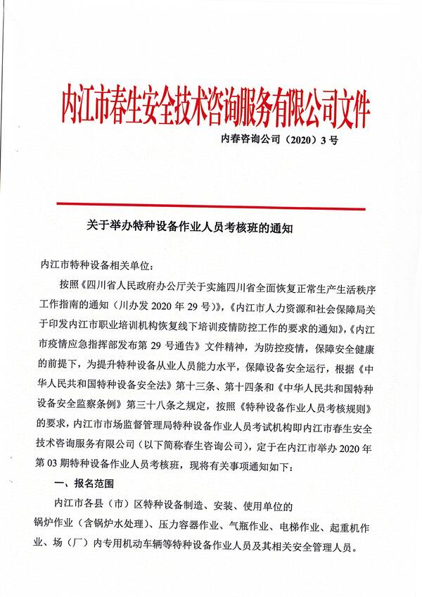 2020年第三期特種設(shè)備作業(yè)人員考核培訓(xùn)班的通知