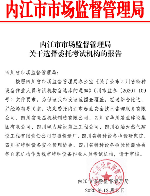 內(nèi)江市市場監(jiān)督管理關于選擇委托考試機構的報告